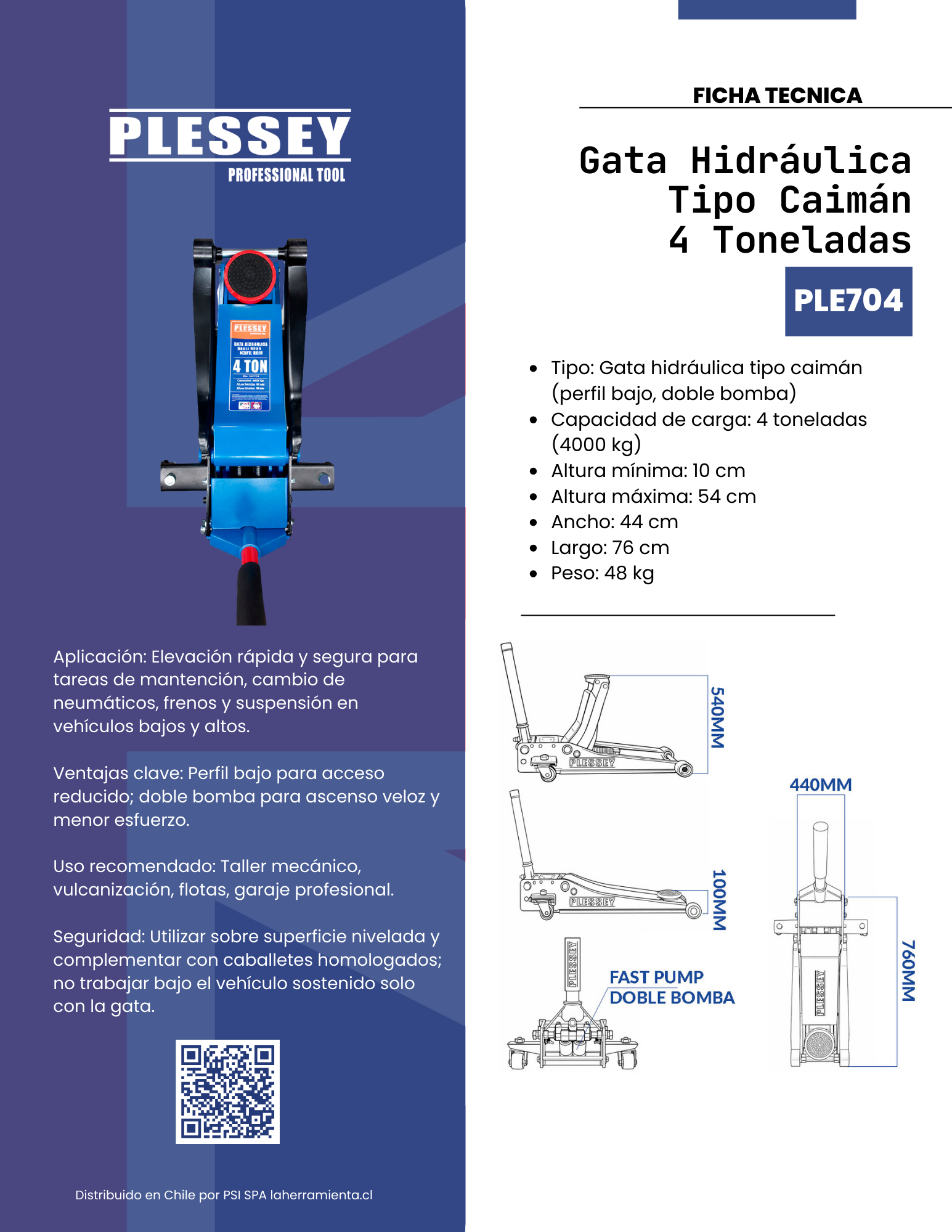 Gata hidráulica tipo caimán Plessey PLE704 (4 toneladas), diseñada para uso intensivo en taller. Su perfil bajo permite el acceso bajo chasis con altura mínima de 10 cm y eleva de forma rápida y fluida hasta 54 cm gracias al sistema Fast Pump (doble bomba).